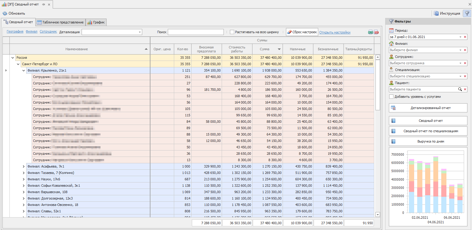 Естественно, руководству компании в любой момент времени доступны актуальные аналитические данные по любому срезу данных, в произвольной группировке, за любой период времени.