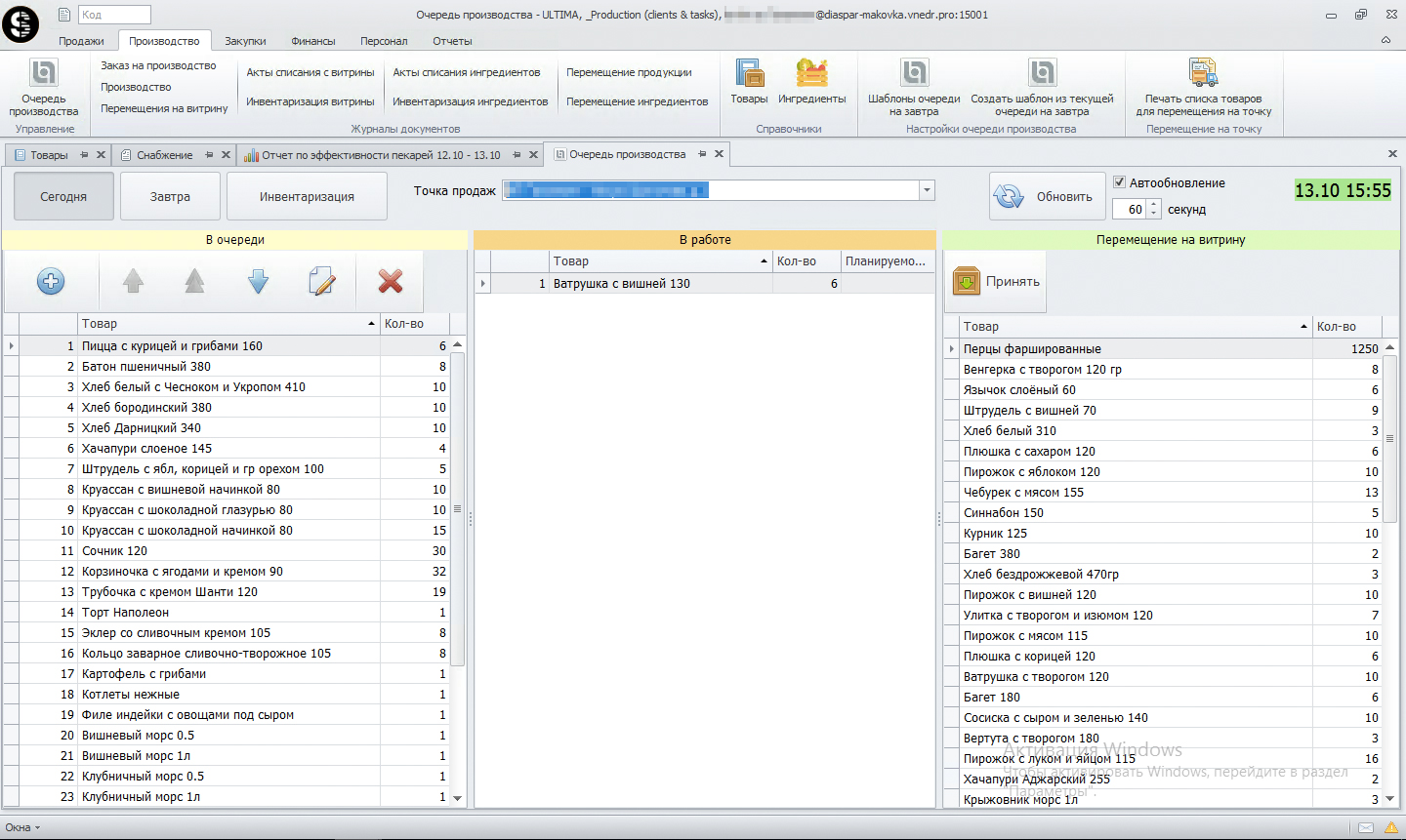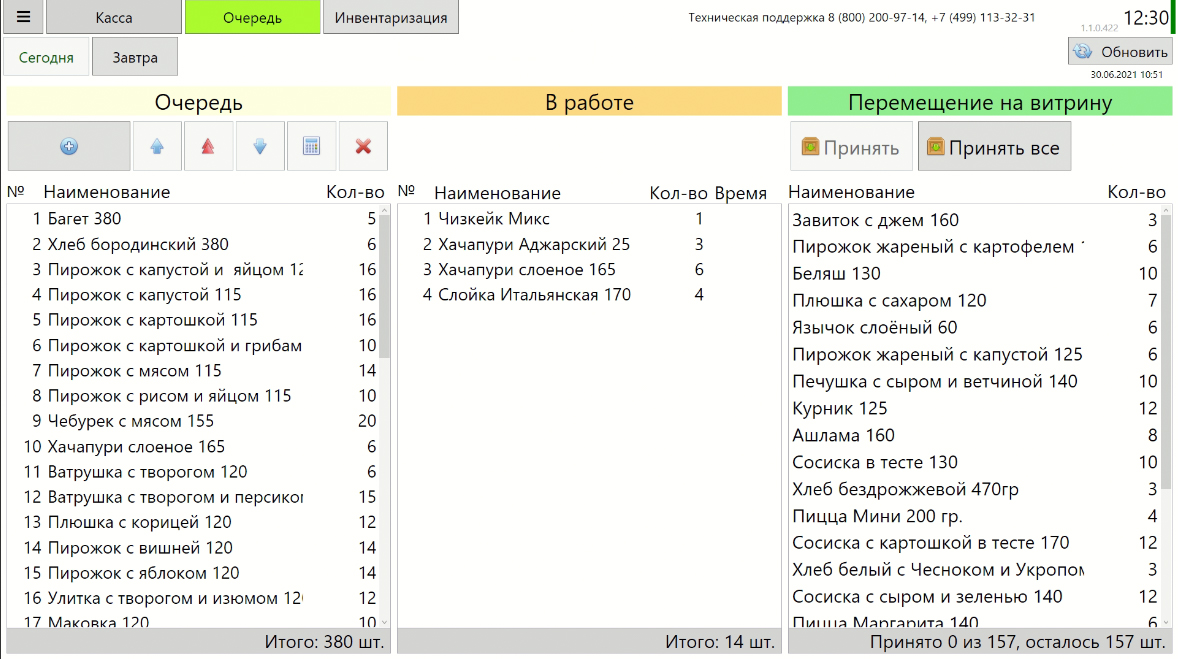 Испеченные булочки прямиком попадают на витрину точки, таким образом через инструмент очереди производственных заданий кассир прямо управляет витриной.