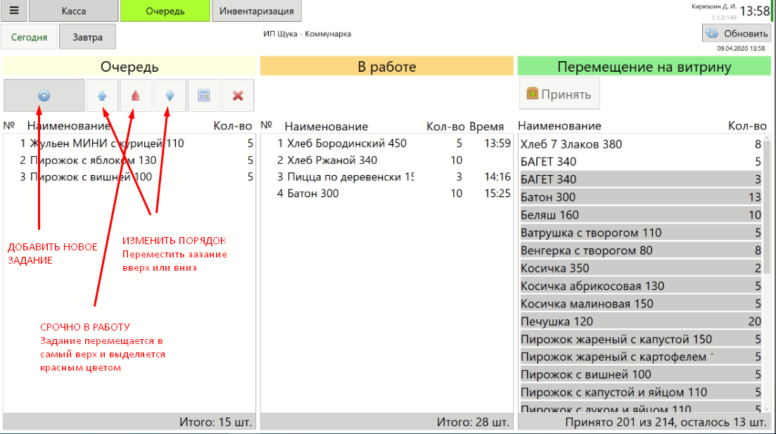 Итак, очередь формируется кассиром (аналогичный функционал разумеется доступен, при настройке прав, администратору и пекарю).