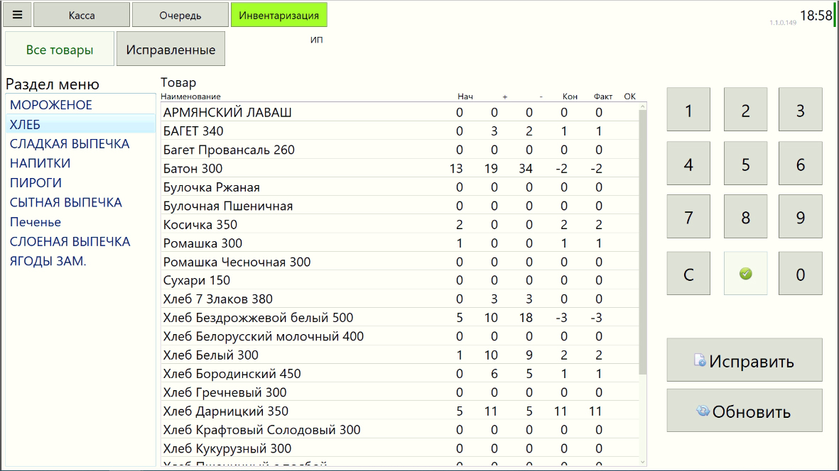 Рис. 8 Инвентаризация в интерфейсе Кассира. Мобильное Windows-приложение dia$par