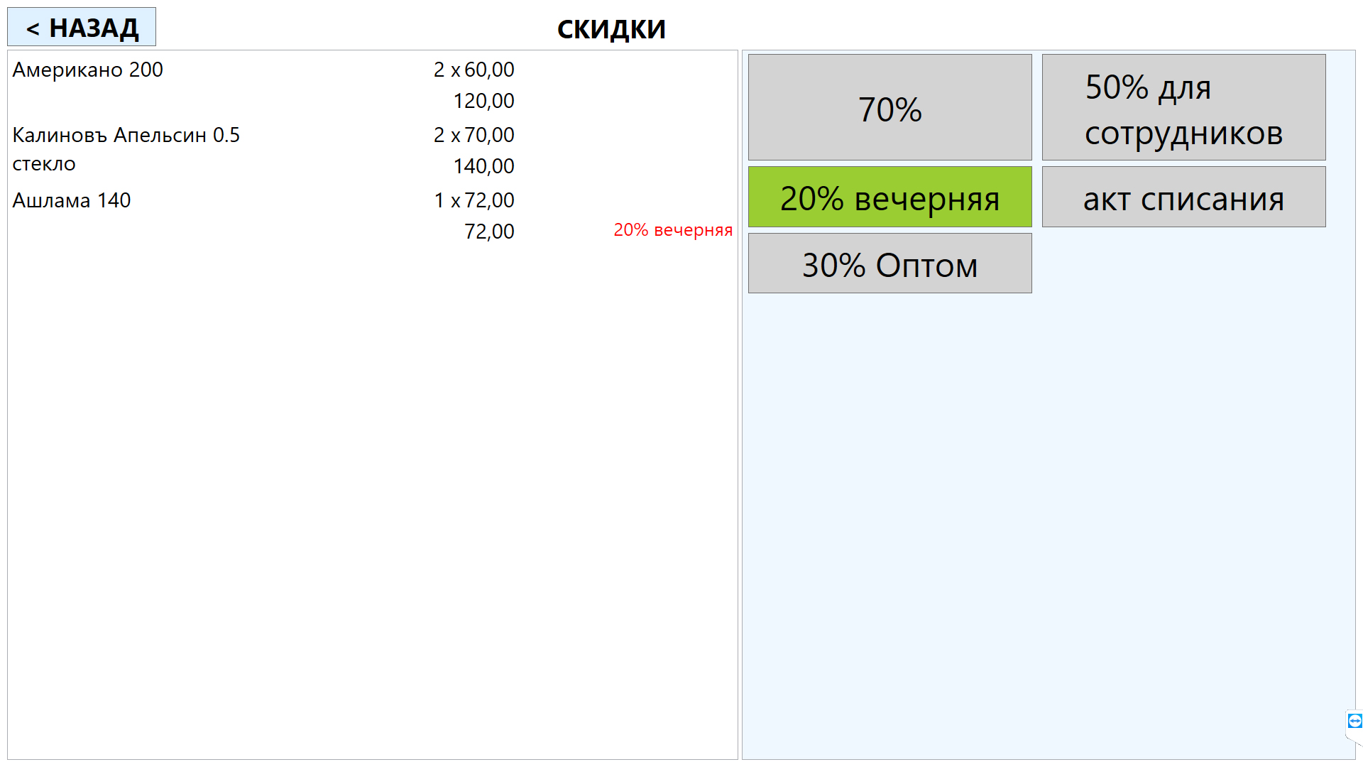 Любая функция кассы делается под флагом «минимум нажатий — максимум понятности», и скидки не исключение.