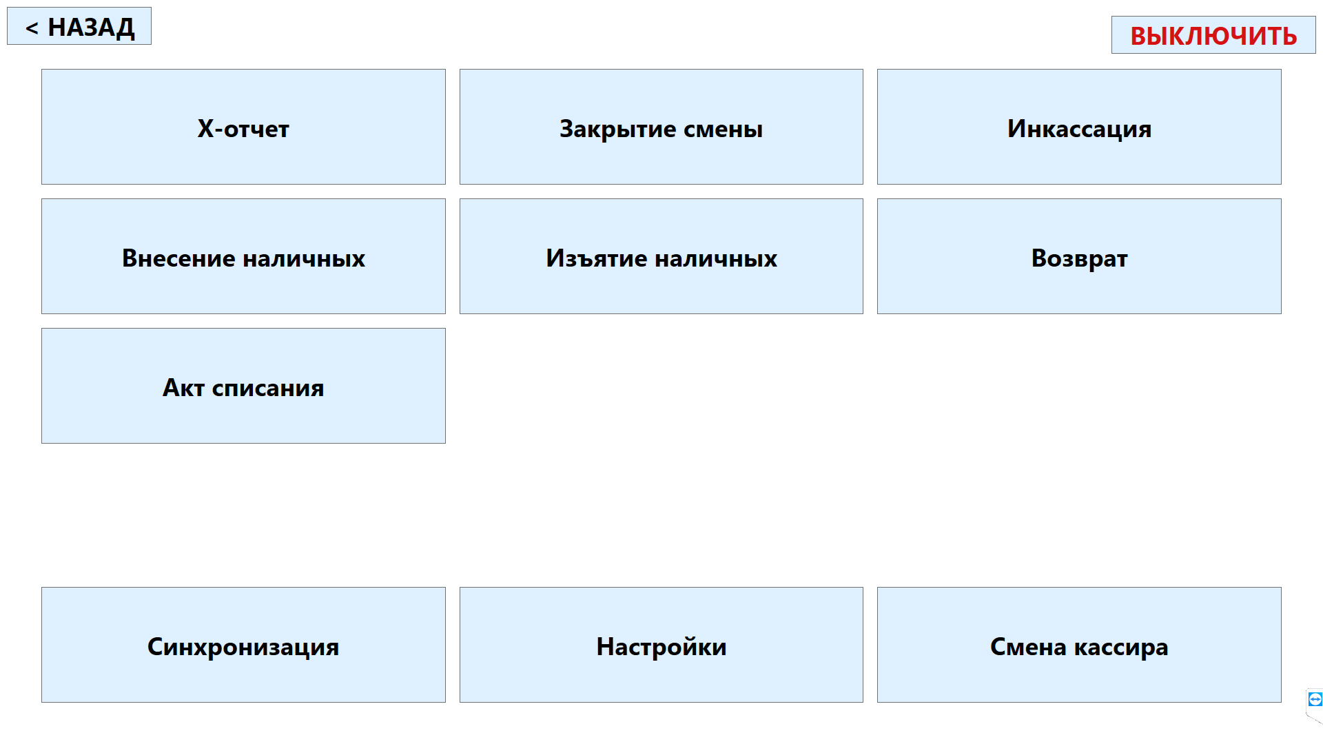 Простые и понятные кнопки-операции «Х отчет», «Изъятие», «Внесение», «Инкассация», «Закрытие смены», также вопросов не вызывают.