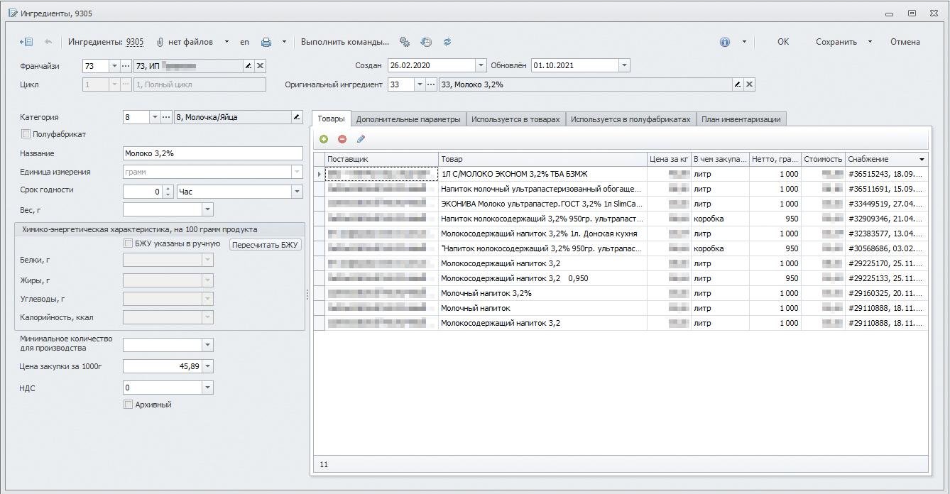 Заполняя приходную накладную, мы используем номенклатуру поставщика и сопоставляем их с нашим ингредиентом «молоко».