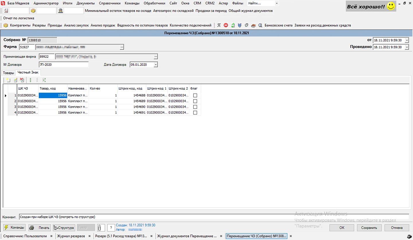 Бизнес-логика дополнена новым типом документов «Перемещение штрих-кодов Честного Знака» — используется для перекладки маркировки ЧЗ между своими юридическими лицами.
