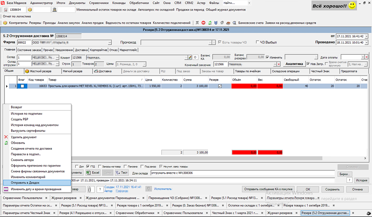 После подписания документа клиентом штрих-коды Честный Знак перемещаются на юридическое лицо покупателя.