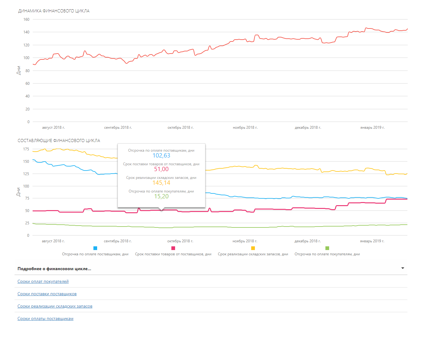 Финансовый цикл и каждая его компонента показываются в динамике.