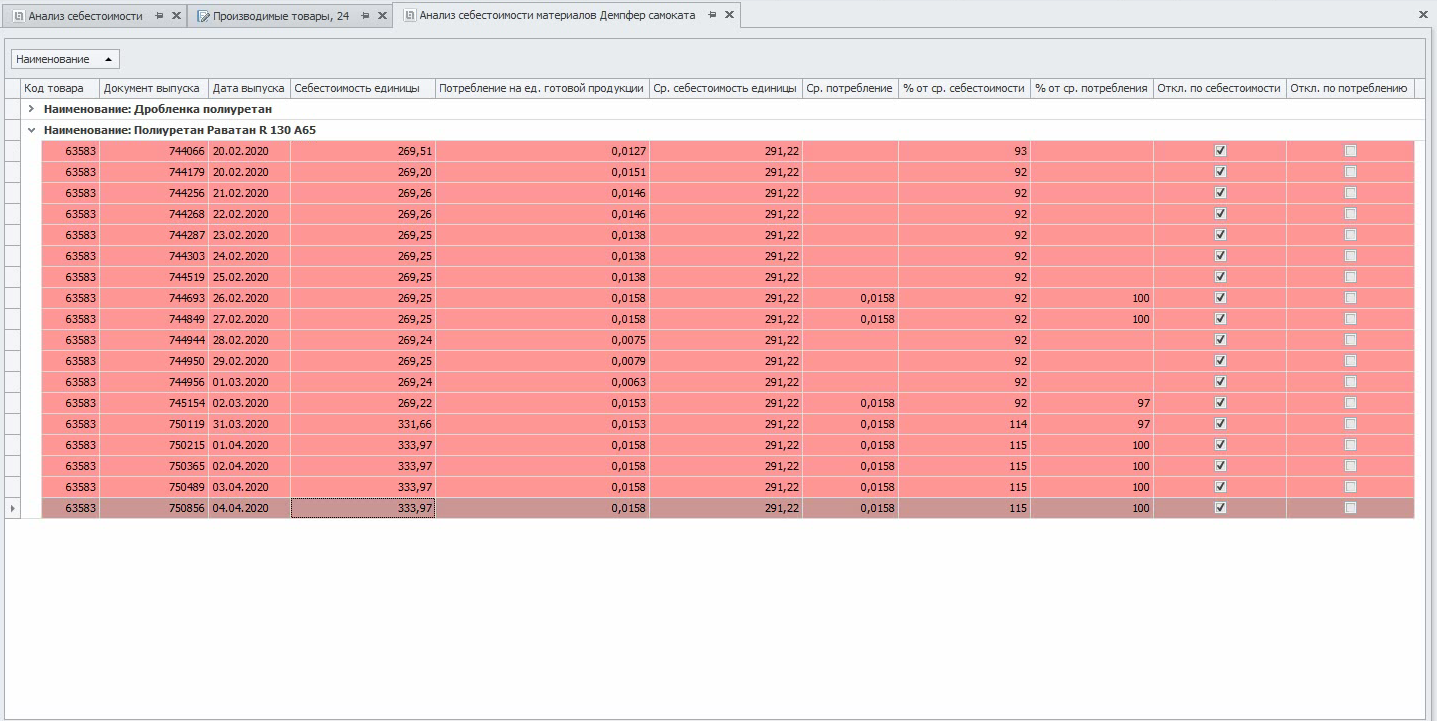 Себестоимость полиуретана увеличилась почти на 25%. Обратите внимание, что отклонения считаются и по себестоимости, и по потреблению.