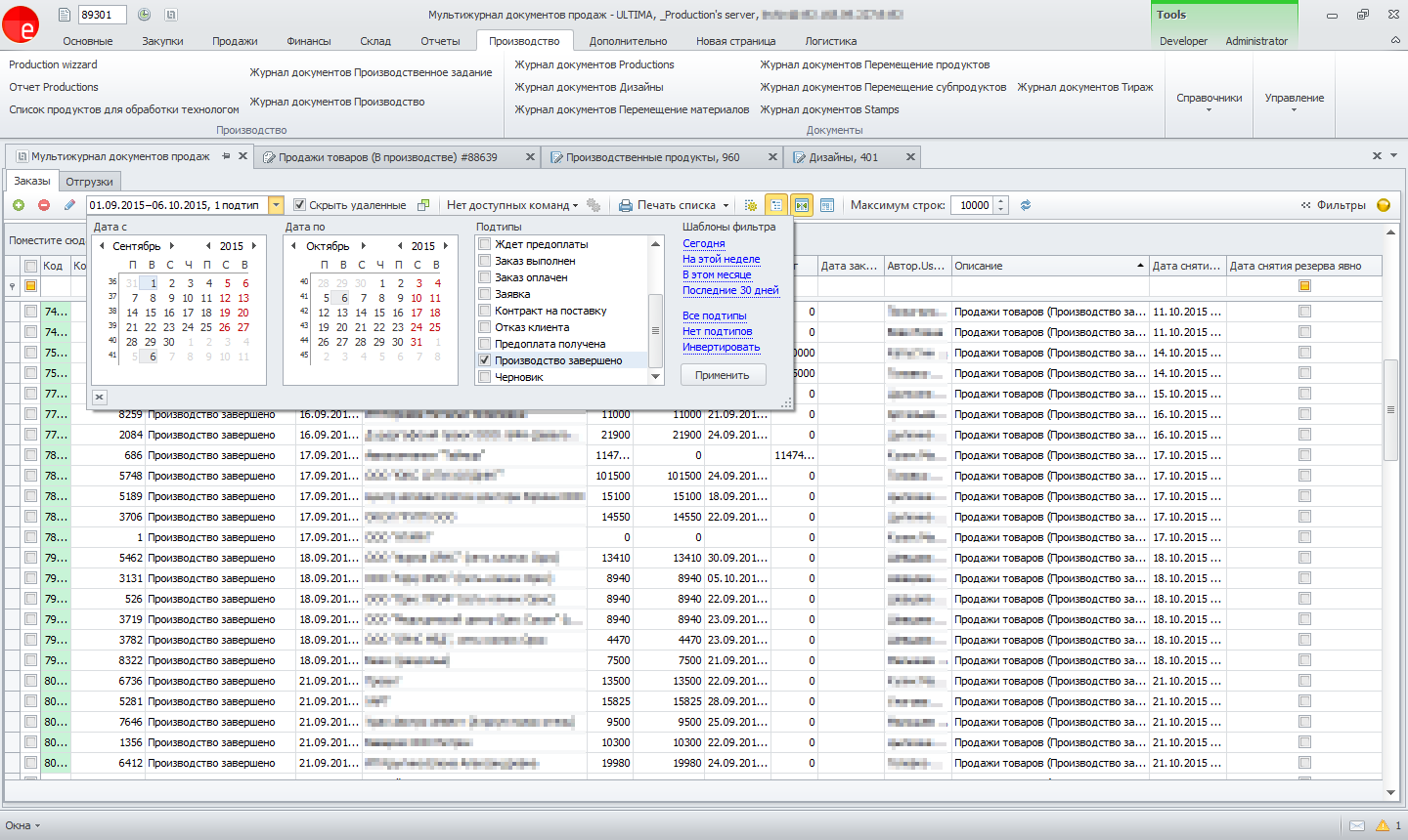 В интерфейсы системы менеджер в онлайне видит очередь на производстве, на каком этапе оного находится заказ, его наличествующую комплектность, прогноз по дате-времени исполнения.