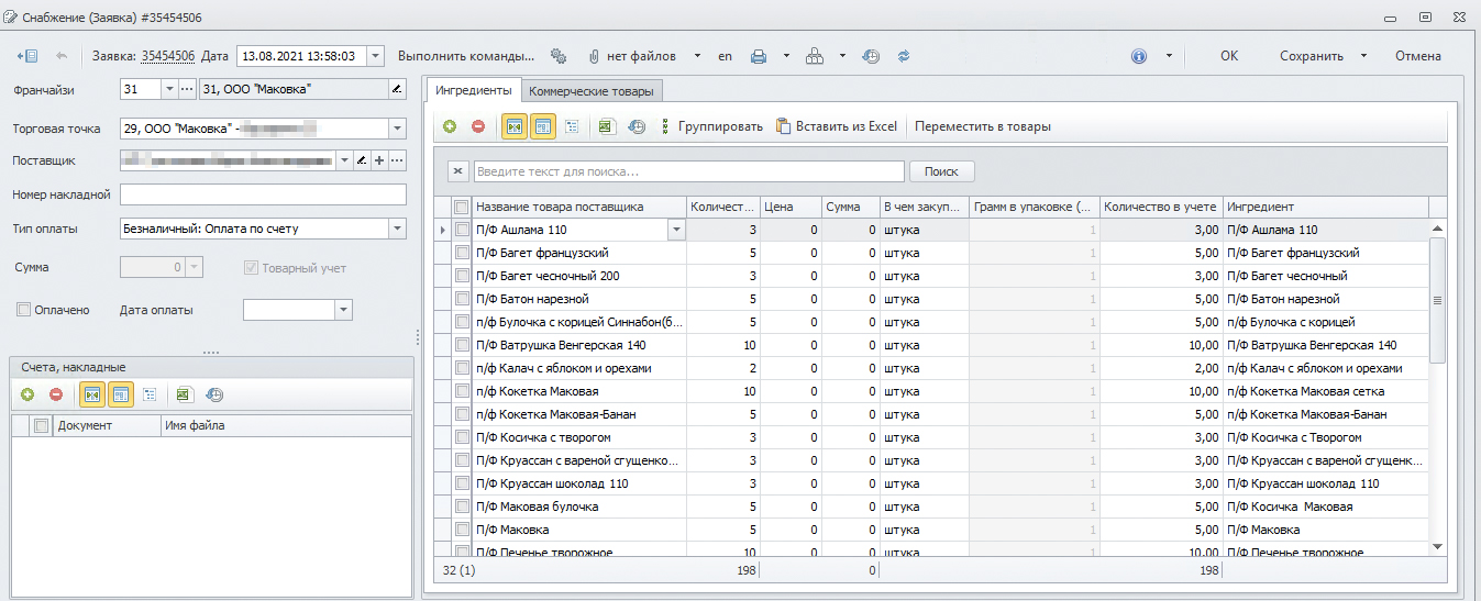 Заполняя приходную накладную, мы используем номенклатуру поставщика и сопоставляем их с нашим ингредиентом «молоко».