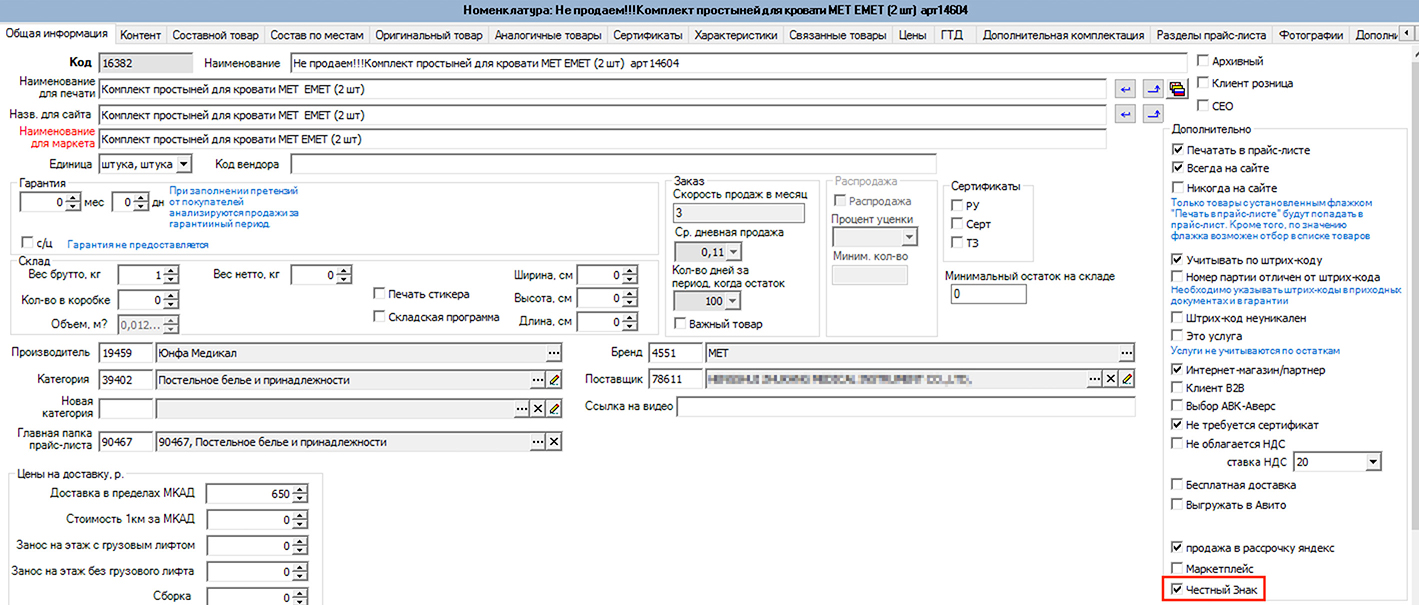 Для артикулов, подлежащих маркировке, галка активируется.