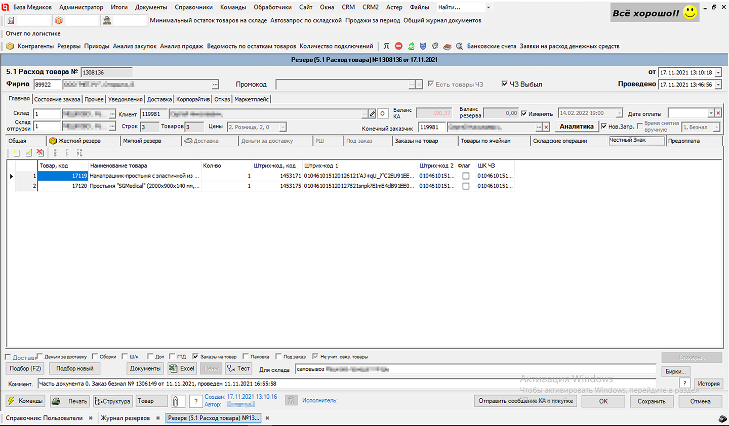 После подписания документа клиентом штрих-коды Честный Знак перемещаются на юридическое лицо покупателя.