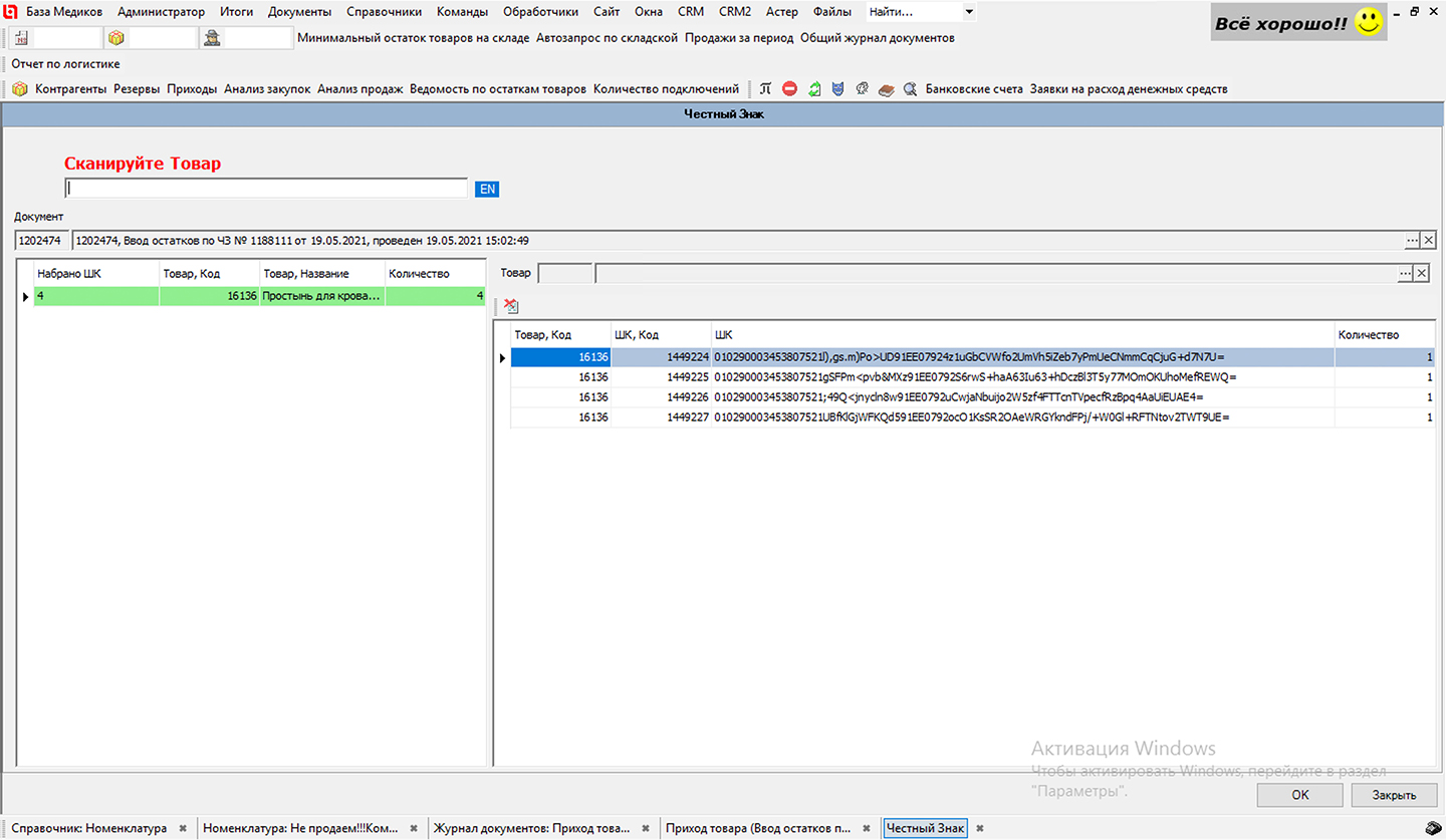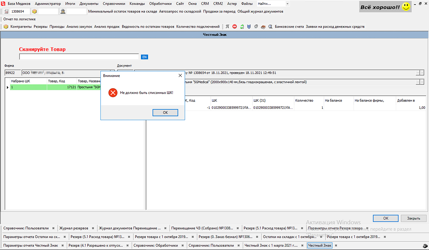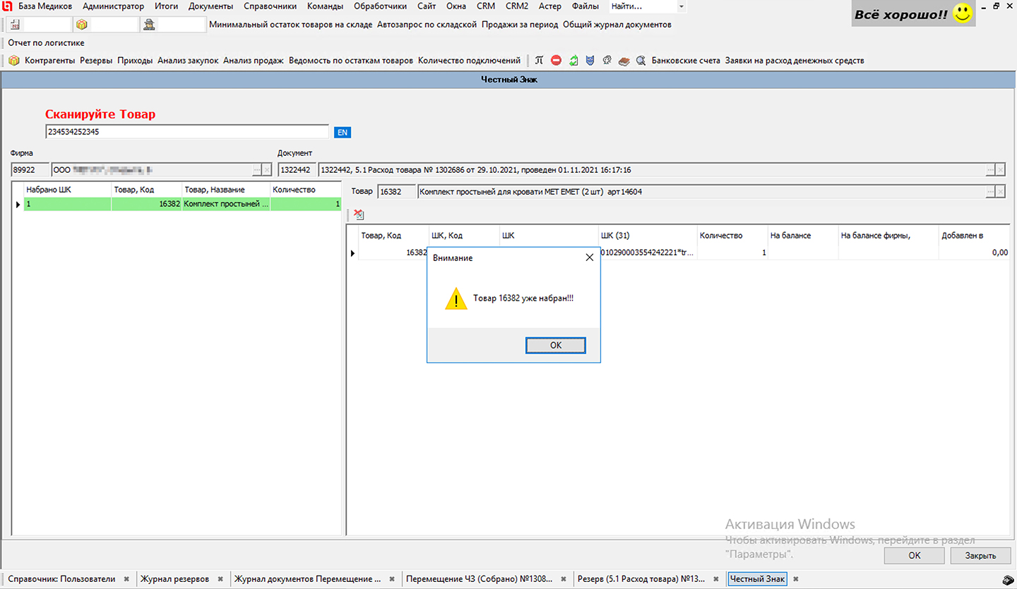 Рис. 5 «Защита от дурака» — автоматическая проверка корректности вводимой маркировки ЧЗ. Все штрих-коды ЧЗ для маркируемого артикула уже введены